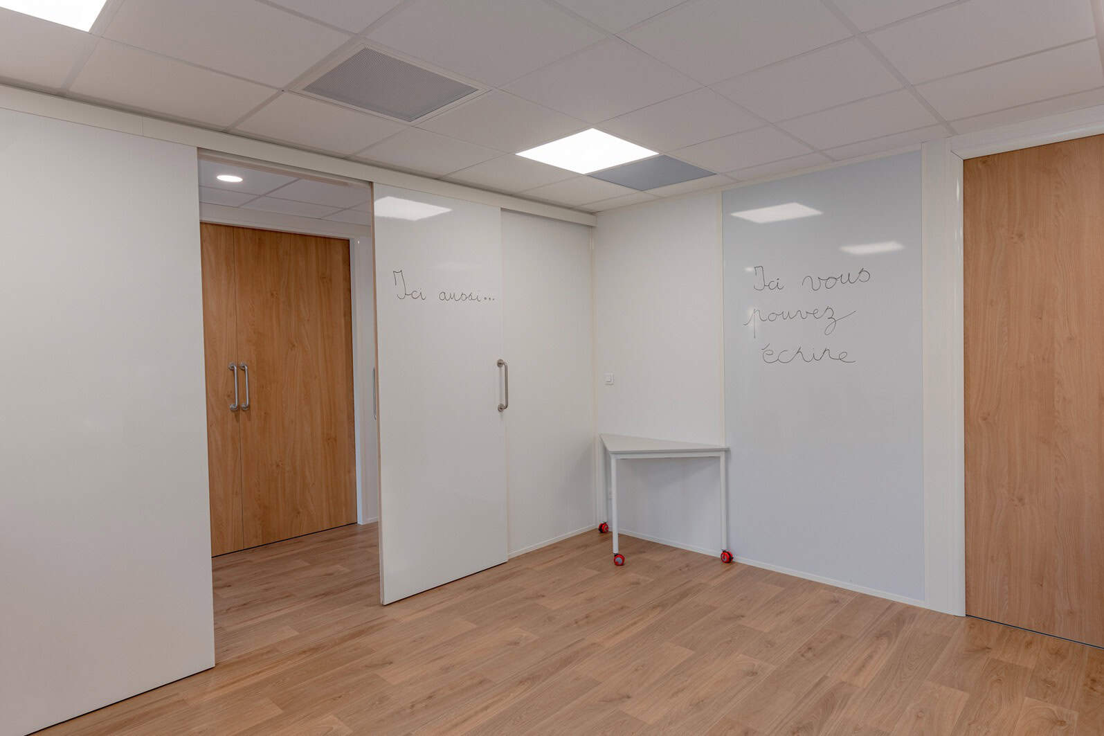 Pour optimiser la configuration des espaces, nous avons mis en place 450 m² de cloisons modulaires pleines et semi-vitrées, intégrant des vitrophanies. Ces cloisons offrent une flexibilité dans l’aménagement des bureaux tout en garantissant une séparation efficace des zones de travail, favorisant ainsi la confidentialité et l’interaction.